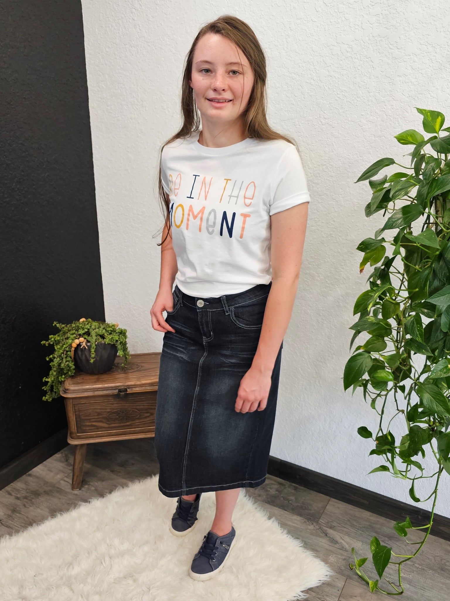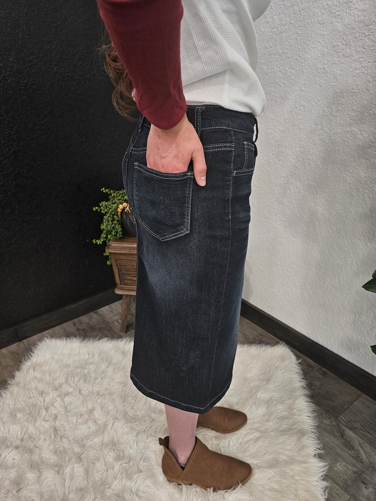 This stylish Black Denim Skirt will quickly become your Autumn staple! Its beautiful black wash is lightly distressed for a trendy look, and it features convenient pockets. Enjoy the perfect balance of comfort and style all season long!