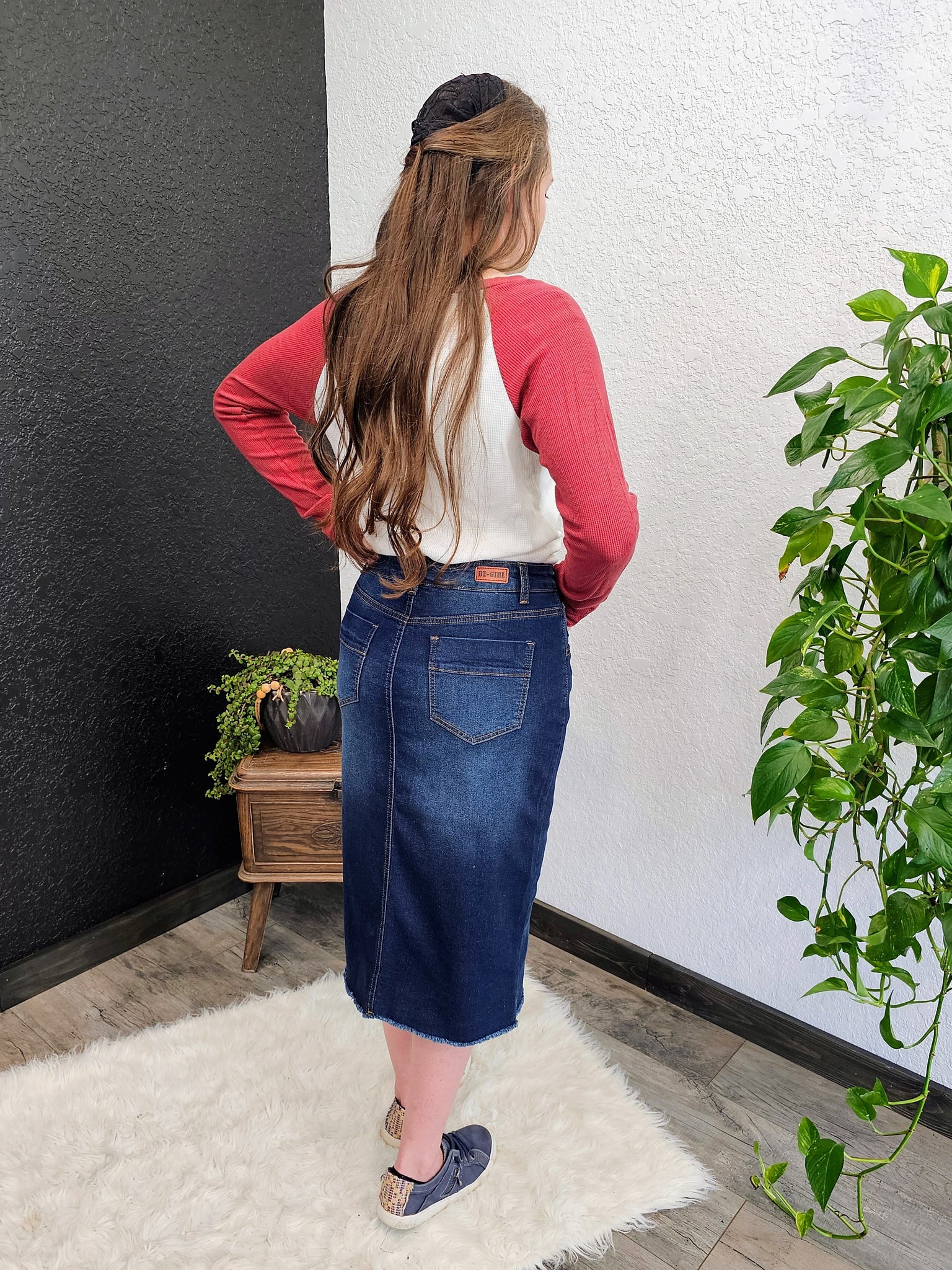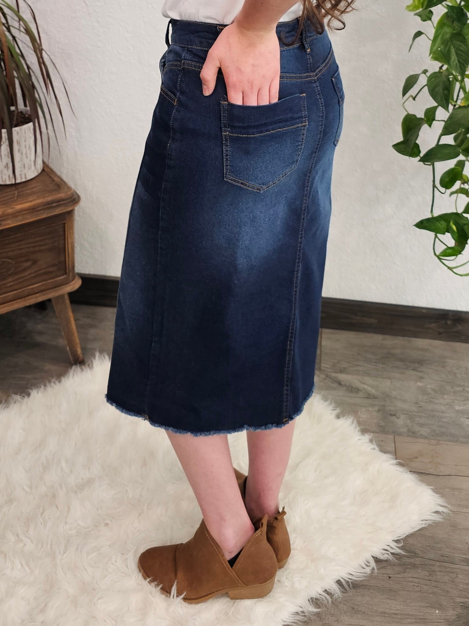 Make a statement in this Frayed Hem Denim Skirt. Comfortable and stylish, it features a cute distressed look, decorative seams, thread detail, and four silver buttons. Pockets and a frayed hem make it perfect for any occasion.