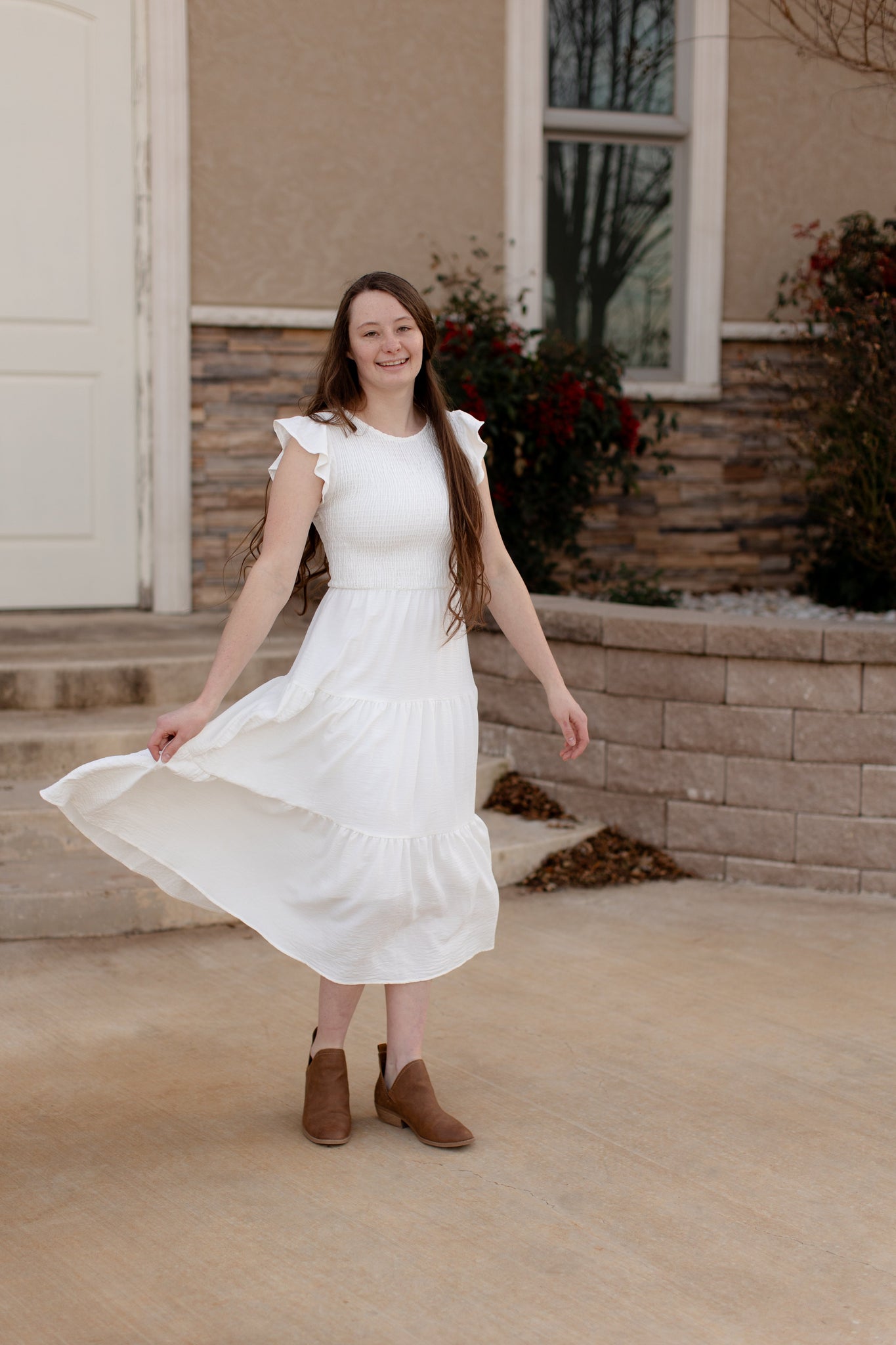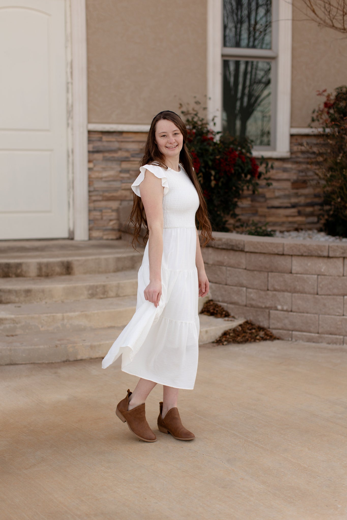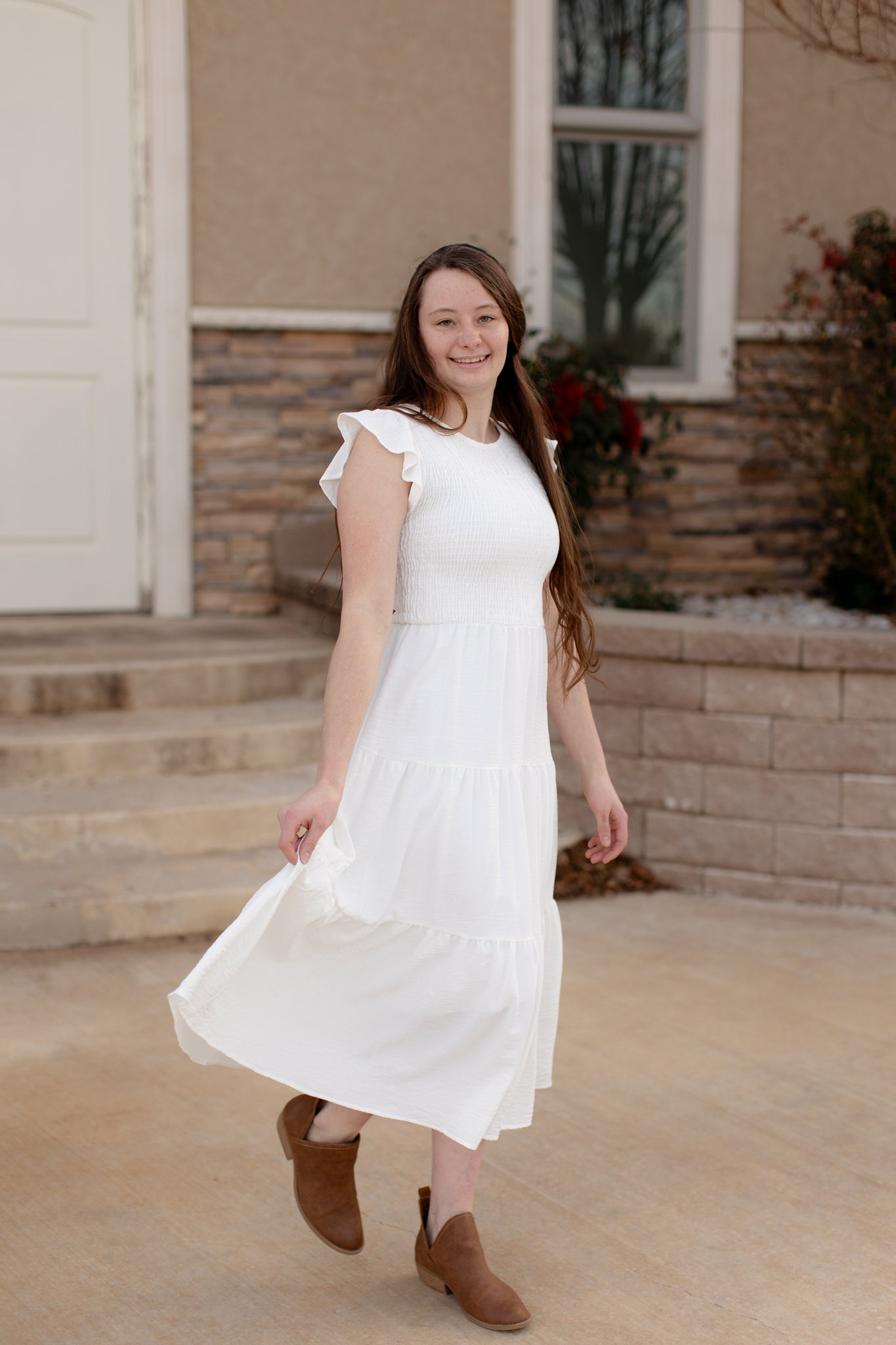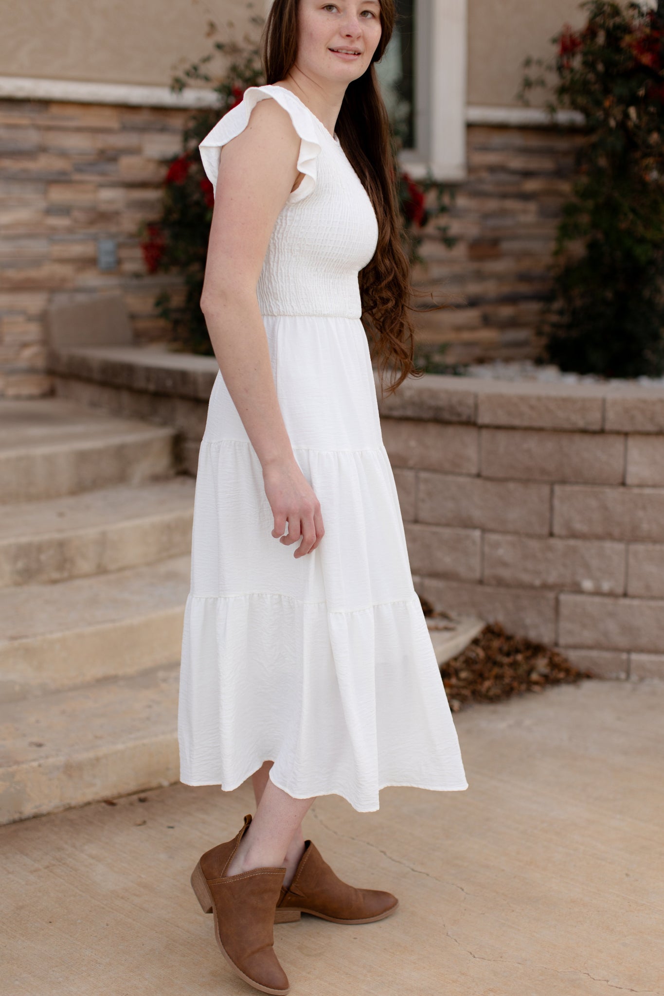 Experience the airy comfort of the Gracie dress with its white gauze fabric and smocked top. The short cap sleeves add a touch of elegance, while the tiered skirt gives a flowy and flattering silhouette. Perfect for any occasion, feel effortlessly stylish and comfortable in the Gracie dress.