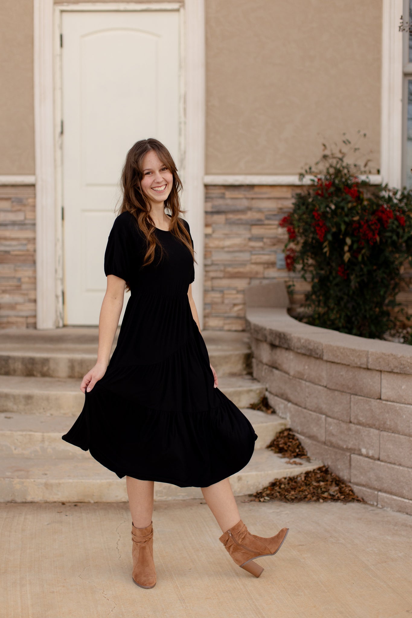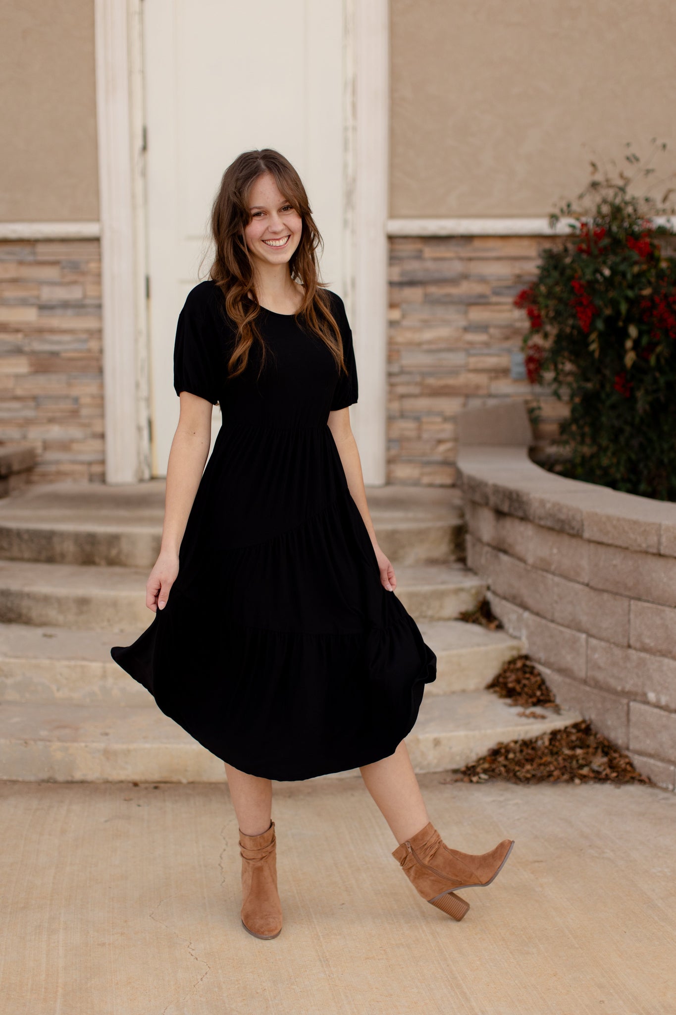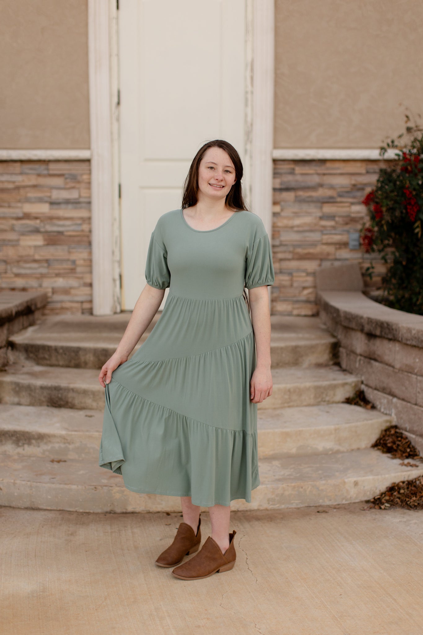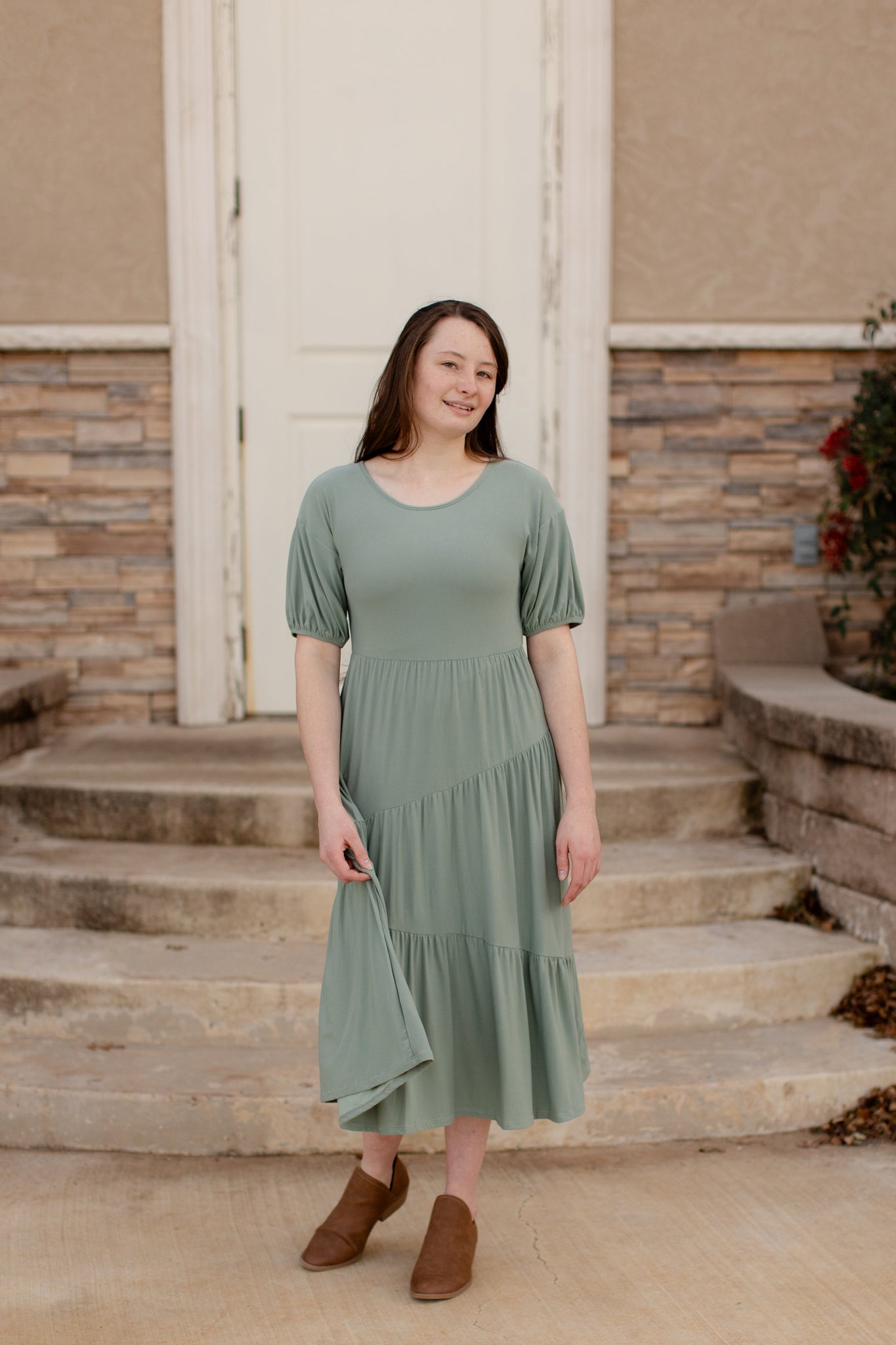 The Jessica dress boasts a unique diagonal tiered skirt and playful bubble sleeves, creating a flowy and stylish look. The jewel neckline adds a touch of elegance to this one-of-a-kind piece. Make a statement and turn heads with The Jessica!