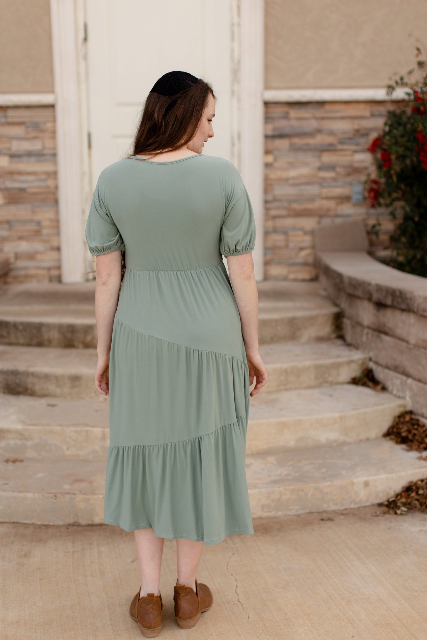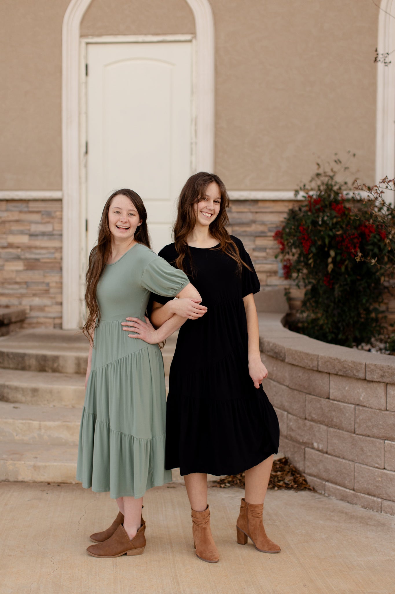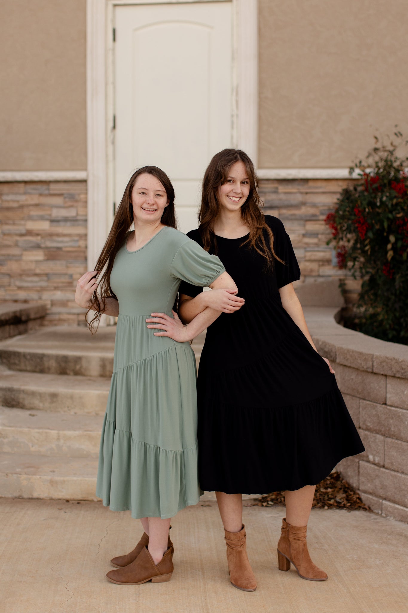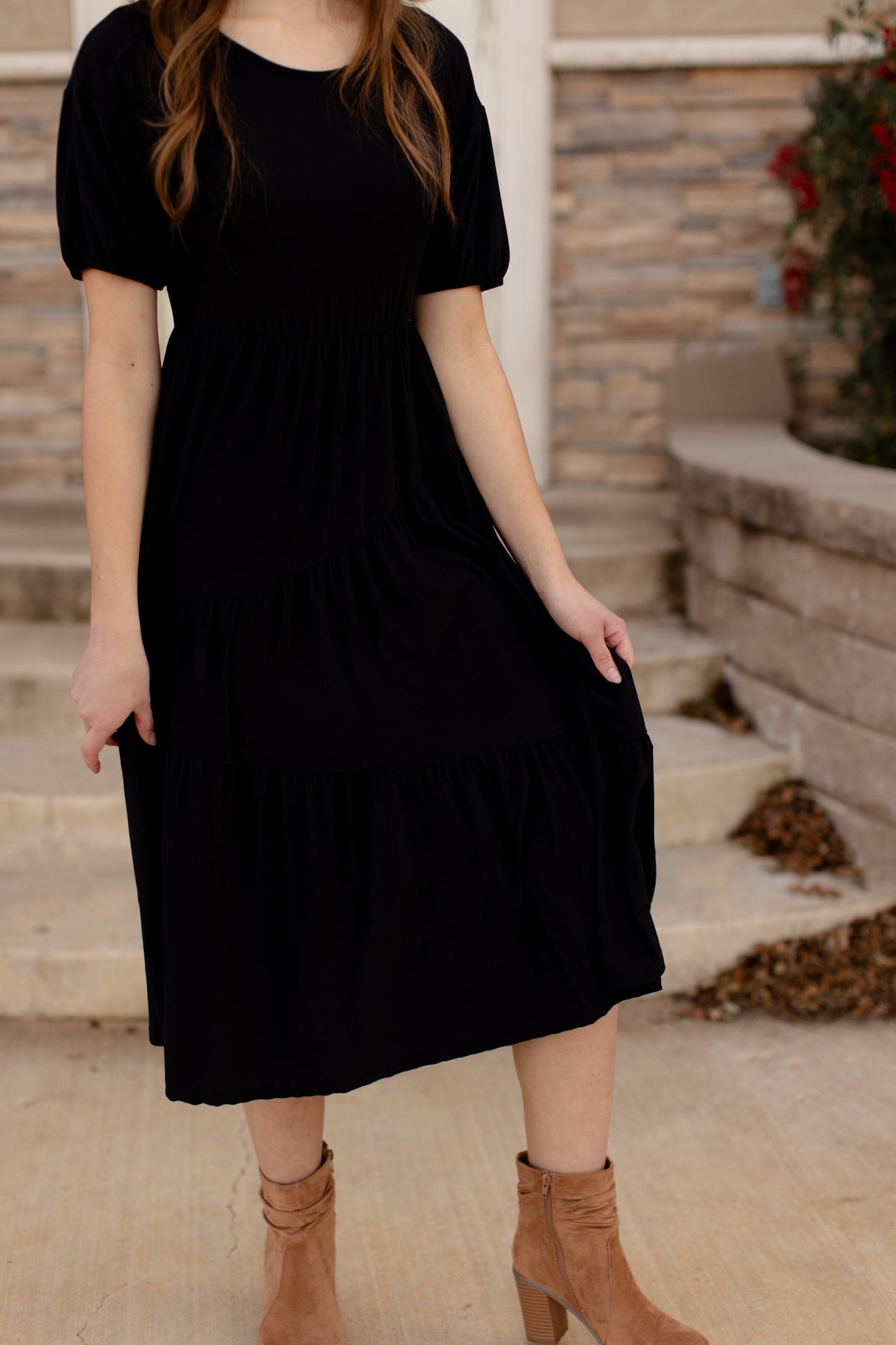 The Jessica dress boasts a unique diagonal tiered skirt and playful bubble sleeves, creating a flowy and stylish look. The jewel neckline adds a touch of elegance to this one-of-a-kind piece. Make a statement and turn heads with The Jessica!